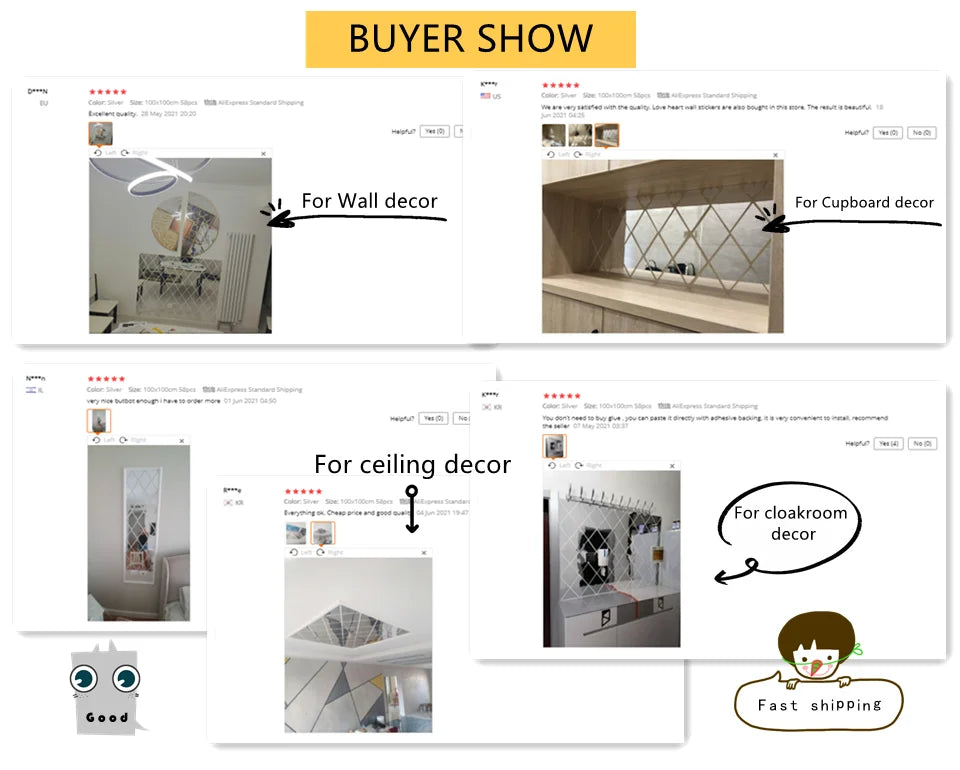 2. This is a mirror wall sticker with a gap in the middle. It is DIY. These can determine the presentation effect of the mirror sticker. The thickness of the wall and the distance of the station are all related. It is mainly for decoration rather than a mirror. Hope we can buy it before Watched many buyer shows